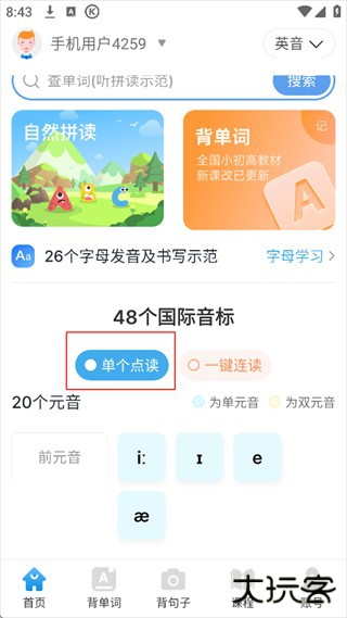 1、在缤纷英语音标助手的首页可以看到有自然拼读、背单词和48个国际音标