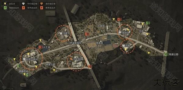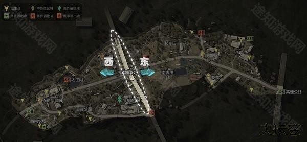 如上图所示,农场中部断裂的桥梁将农场分为东西两部分。玩家在战术行动中进入时的出生点和常驻撤离点分布在地图的东西两侧。一般来说,如果出生点在西侧,那么默认的撤离点就会在东侧,反之同理。所以先锋们不管出生在哪里,行进路线基本为“从左到右”或“从右到左”。地图中战利品价值比较高的区域有:谷物交易站、装卸区、别墅、马厩、汽车旅馆。除此之外,北麦田露天堆放处、南麦田小屋也有一些武器箱和抽屉可以搜索。接下来我将以从西到东的顺序,依次向先锋们介绍主要资源点物资分布情况。