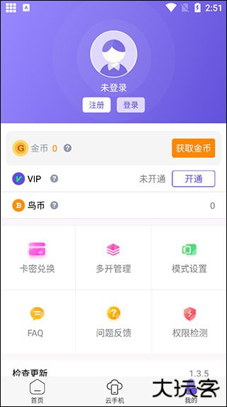 卡密兑换、多开管理、模拟设置、FAQ、问题反馈、权限检测