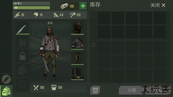 5、背包管理系统: 点击背包图标查看角色生命值 / 饥饿度 / 感染状态 ,通过拖拽装备图标实现武器切换与防具装配。