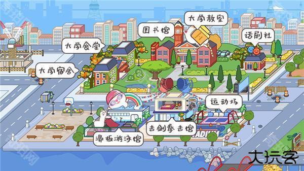 2、大学宿舍、大学食堂、图书馆、大学教室、话剧社、滑板游泳馆、击剑拳击馆,运动场;