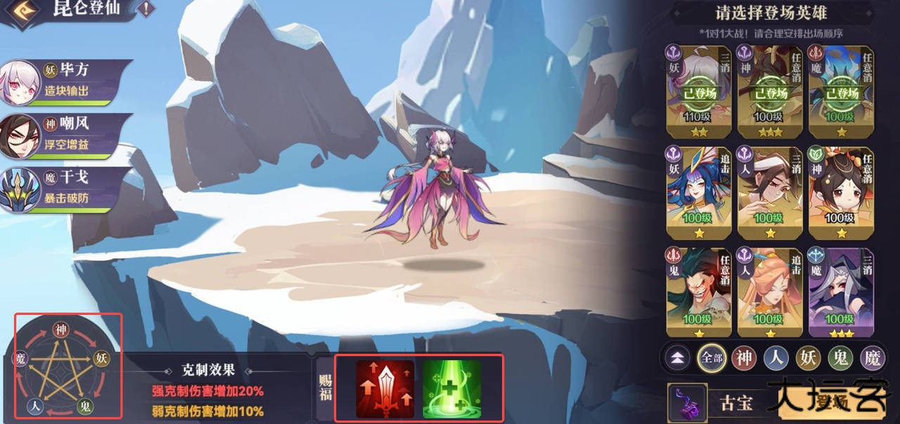 “昆仑登仙” 玩法中,系统仅激活英雄间的种族克制增益。强力克制关系可提升 20% 伤害,普通克制则可提升 10% 伤害。传统的消除加成与灵兽系统在此模式无法使用。出战前务必审慎检查敌我双方英雄的种族属性,及时调整阵型布局,避免因被对手克制而导致对战效率降低(实战经历总结的经验)。