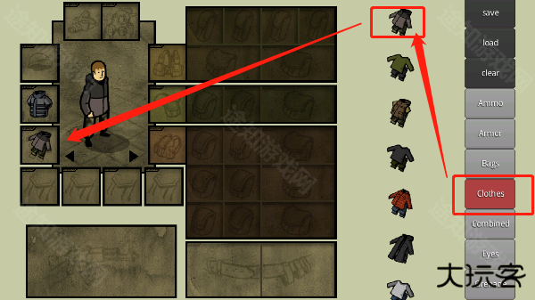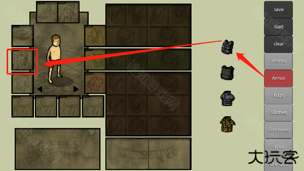 进入我的士兵游戏首页,游戏开始后可点击右侧一列框中的任意一项(初save.land.clear)每一项为所对应的内容。例:bag为书包和军用背包,eye为夜视仪和战术护目镜。用手拖动至人物四周对应的方框内,如果对应方框错误则无法保留所选物品。注:暗色部分需放置背包等物品解锁贮存空间