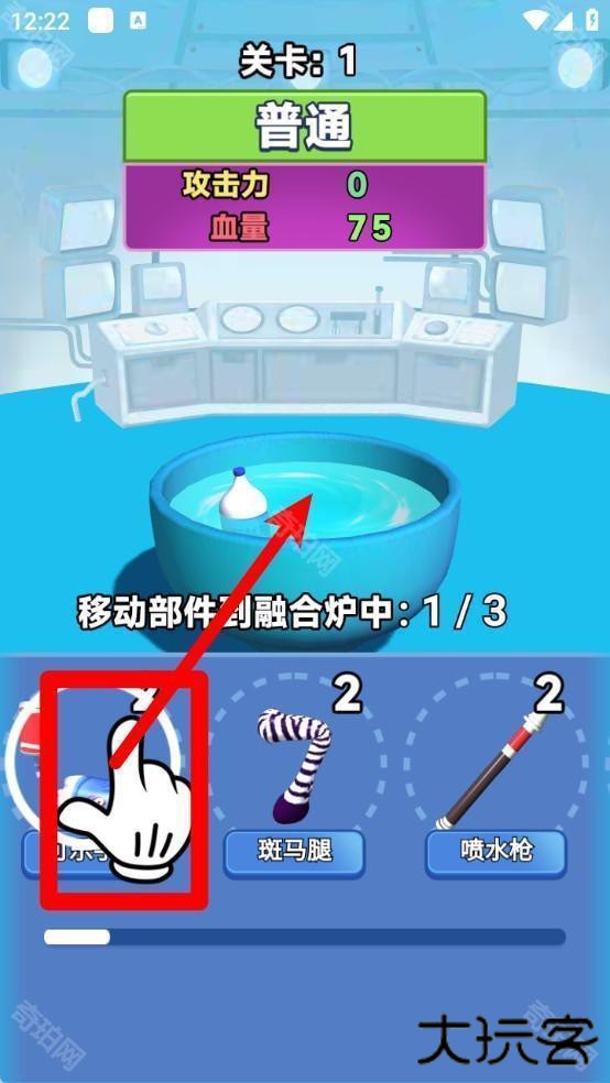 2.用手指长按选中部件图标并拖向融合炉中,按顺序放入所需部件即可完成本阶段融合进度。