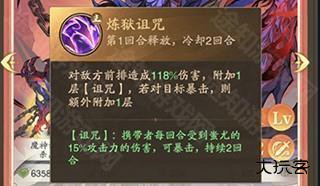 炼狱诅咒是蚩尤唯一的群体攻击手段,附带控制,中规中矩的技能,亮点就是有两回合的爆伤加成。