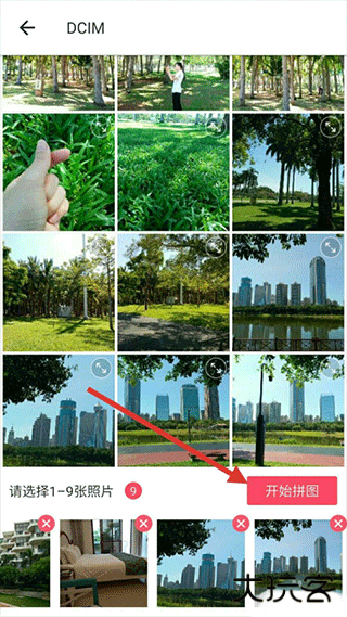 2、进入到自己的相册,一次性最多选9张照片,点击“开始拼图”。
