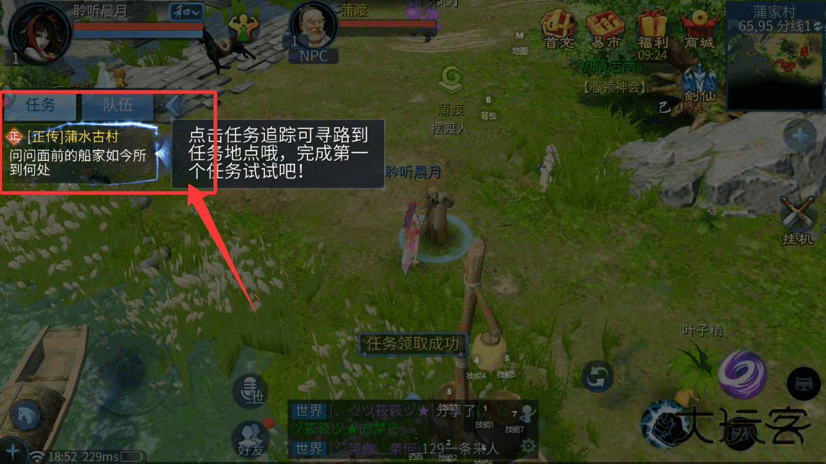 4、进入游戏后即会触发主线任务引导,例如“[正传]蒲水古村”剧情,提示需要向场景内的船家打听信息来推进故事进程。