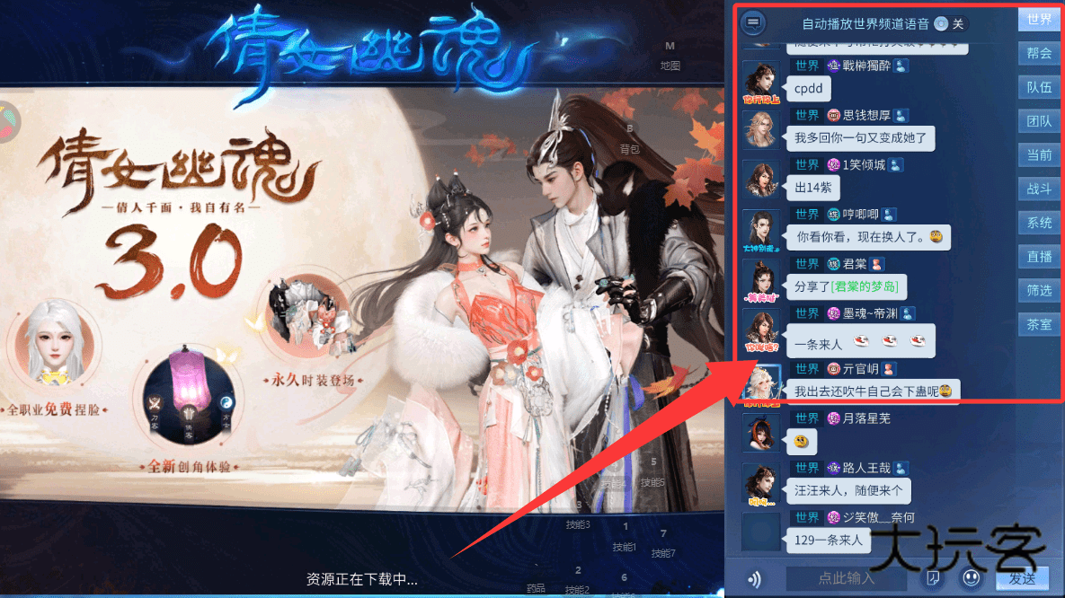 3、打开聊天面板后,可见多个分类频道供选择,例如世界、队伍、帮会及当前场景频道,根据沟通需求点选对应标签即可切换。
