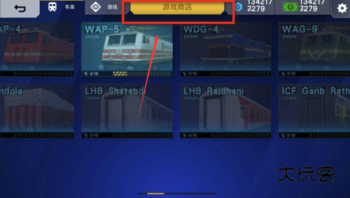 1、进入印度火车模拟器的车库,在游戏中火车一开始不是用钞票买的,而是先用蓝图来解锁或者买火车卡包直接抽蓝图。