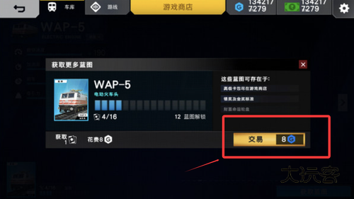 3、解锁火车蓝图的话,就是用蓝色的字眼钻石货币了,点击交易,一般要交易十几二十次才能解锁。