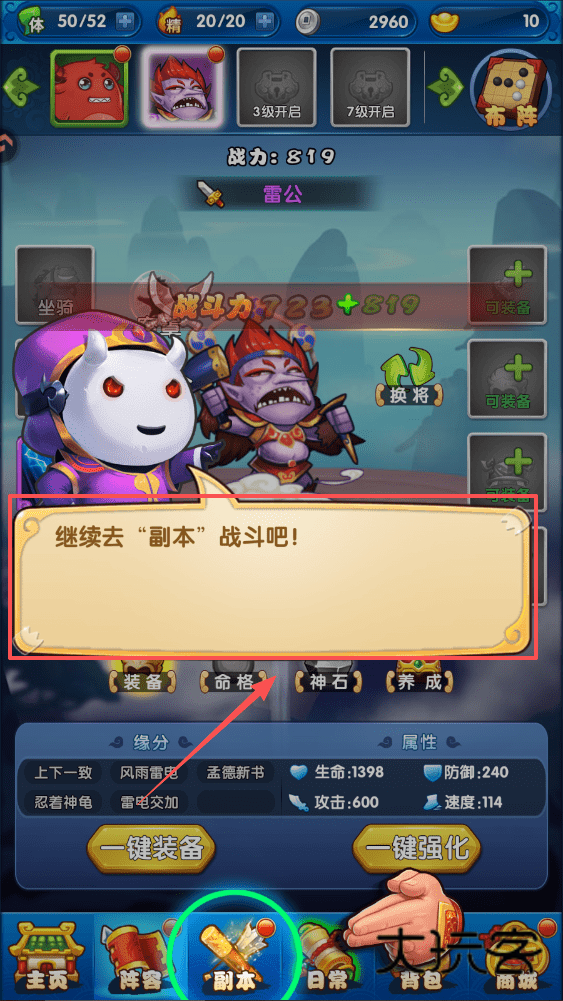 4、装备好后就去挑战更高难度的副本吧,战斗能检验并提升你的队伍强度,注意及时使用“换将”功能应对不同敌人。