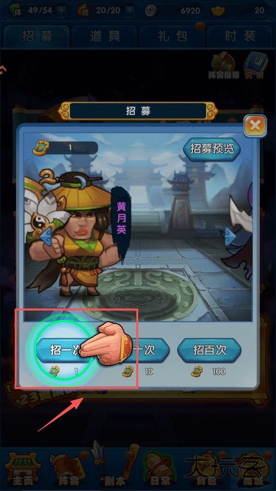 1、在游戏主界面找到“招募”按钮,点击进入后就能看到角色预览了,选择合适的次数点击就能招募心仪角色哦。