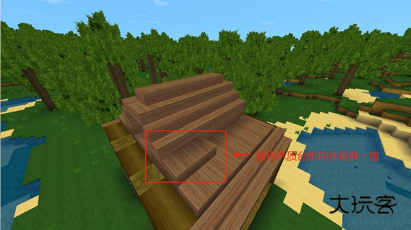 沿着小尖楼顶的边缘,使用木质台阶向外延伸一格,为了保持对称性,左右两边都需要哦。