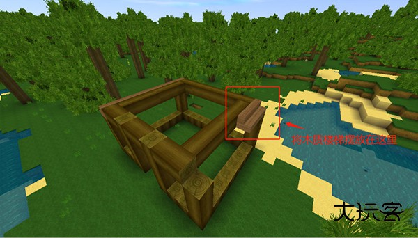 接着把做好的木质楼梯,摆放在房子框架的空格处,作为房子的屋檐――注意方向不要摆错了。