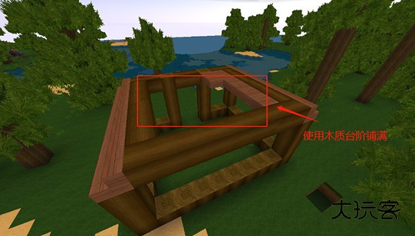 将制作好的木质台阶,把屋顶封起来。