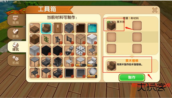 首先使用木头合成一个工具箱,制作木质楼梯。