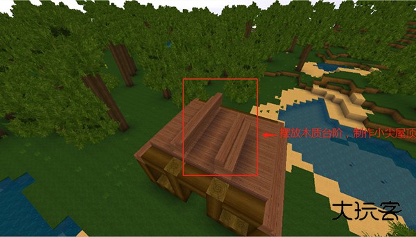 找到屋顶的中心位置,放置木质楼梯,做成一个小尖屋顶的形状。