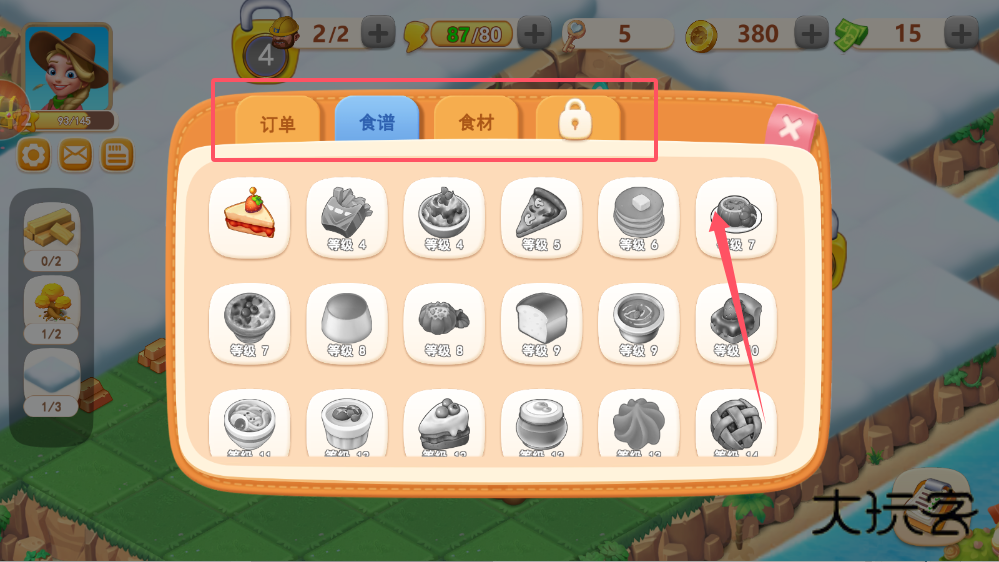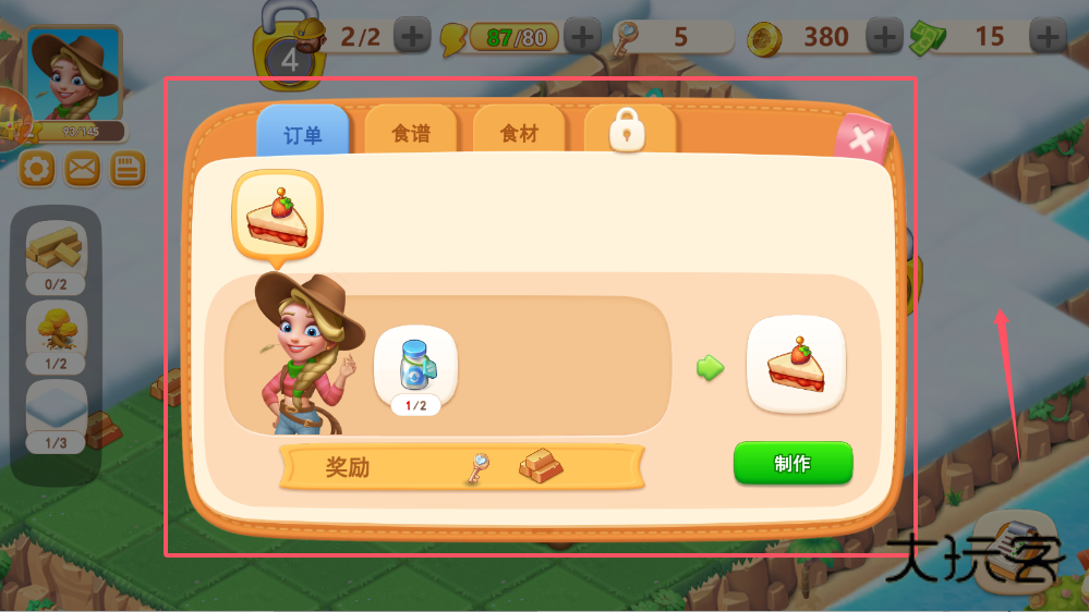 2、牛仔角色发布的订单是你早期获取资源的重要途径。点击“订单”查看具体任务,比如制作蛋糕需要5个罐子。完成任务不仅能获得金币奖励,还能积累经验快速升级。