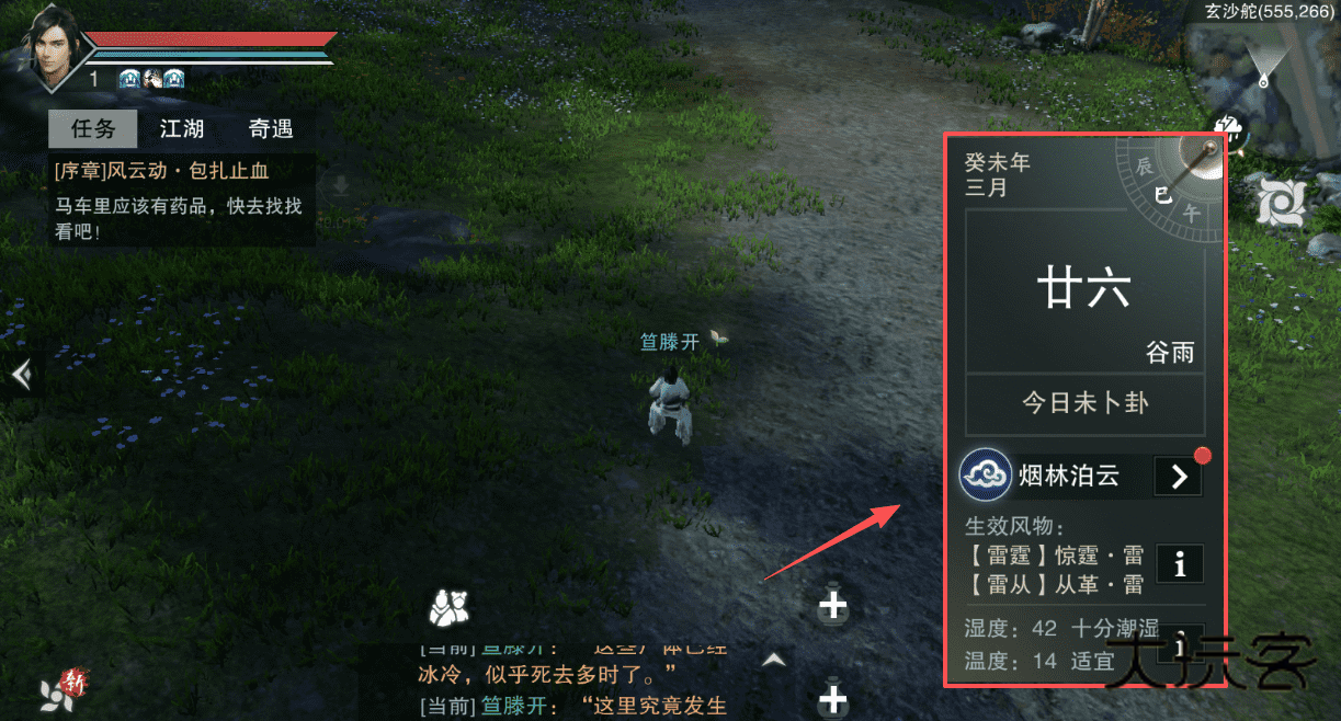 3、左上角头像查看角色状态和任务,右侧关注日期、生效风物等环境信息,对行动有影响。