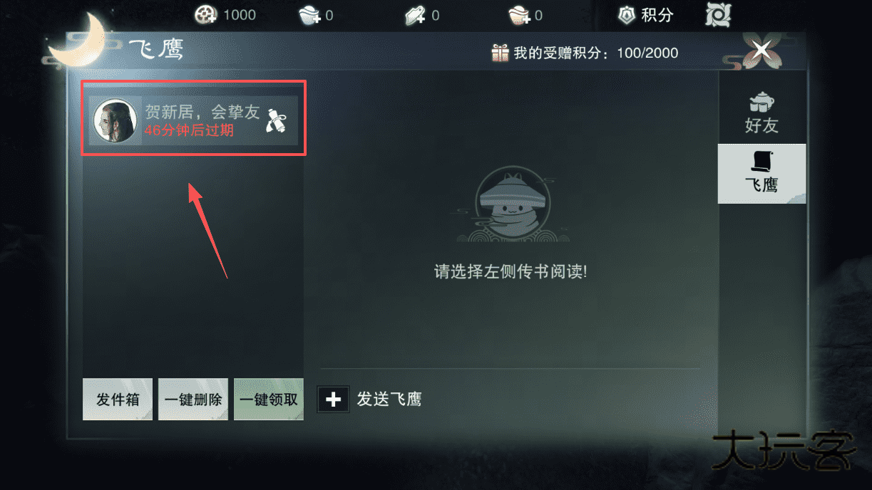 1、飞鹰功能在界面左侧查收邮件,注意过期倒计时,可用一键领取或删除邮件,发送飞鹰在右下角。