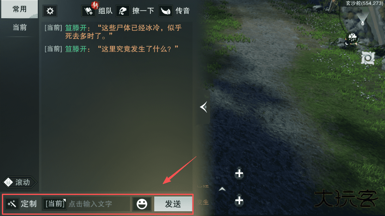 2、聊天需在底部输入框打字,选择当前或常用频道,点击发送即可与附近玩家交流。
