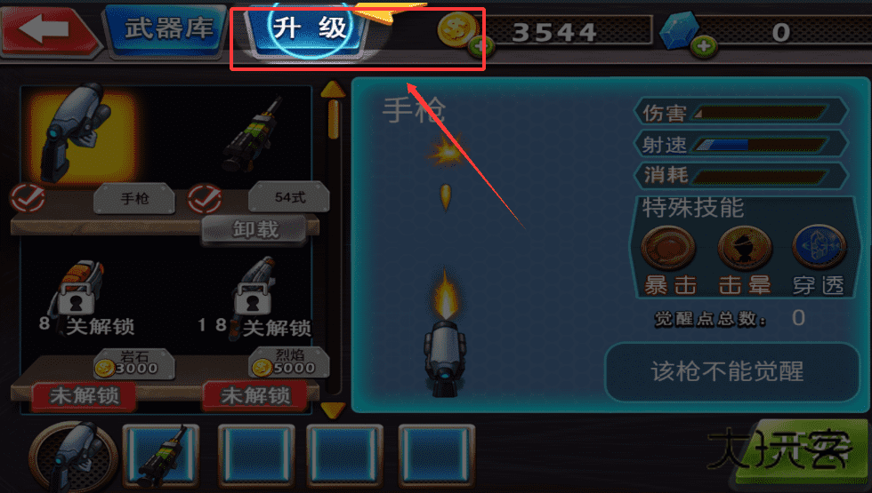 2、特殊技能如“暴击击晕穿透”很有用,但“觉醒点总数”显示为0,表示觉醒功能尚未开放。优先用手头金币升级基础属性,再逐步解锁新武器。