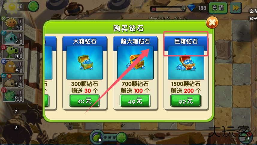 3、弹窗核心位置陈列着三档不同规格的礼包选项,从左至右分别为标注“大箱钻石”、“超大箱钻石”与“巨箱钻石”的组合套餐,每个选项都清楚注明了包含的基础钻石与赠送数量。