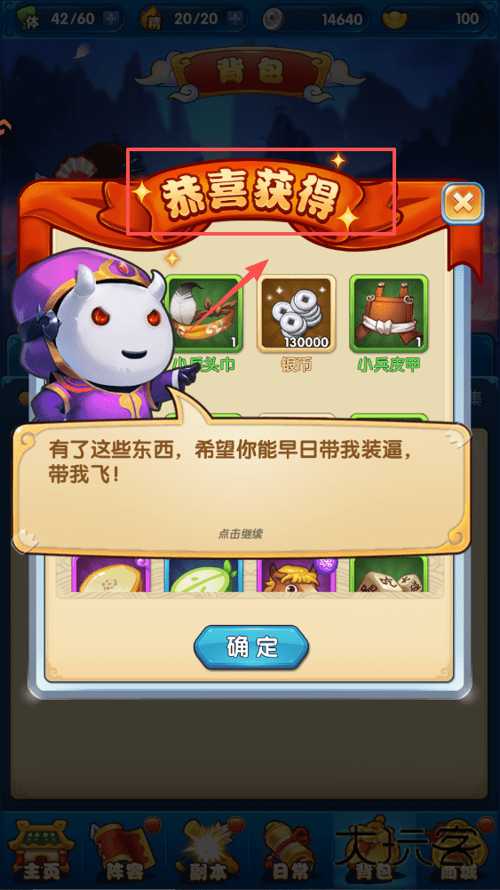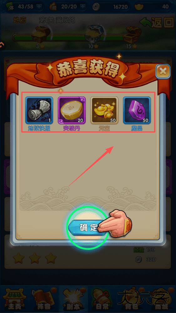 1、获取奖励后记得点击确定哦,在恭喜获得界面可以领取地煞铁棍、突破丹等道具。