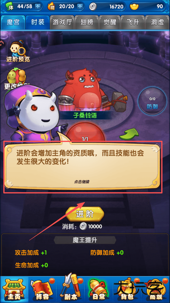 2、想提升角色的话,在主界面找到进阶按钮,预览资质和技能变化后再消耗金币进行进阶。