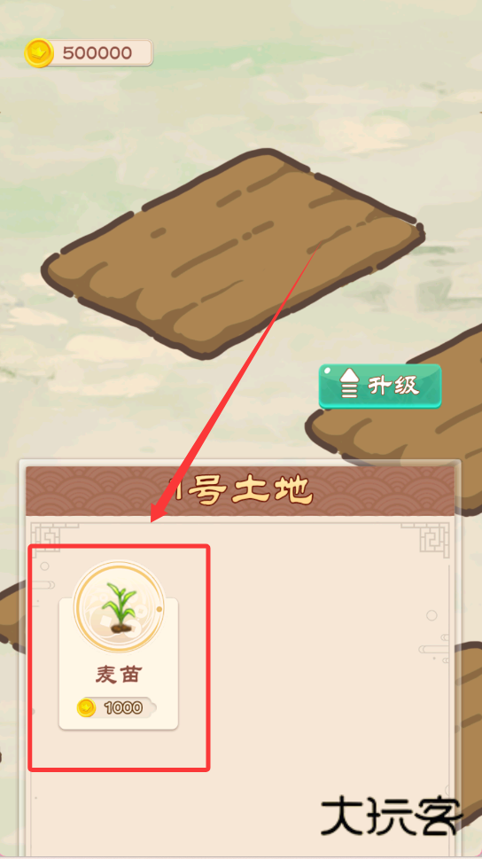 1、打开软件,能看到主界面上的资金、土地和作物信息,熟悉“500000”金币、“1号土地”和“麦苗”这些基本元素,这是你经营的起点。