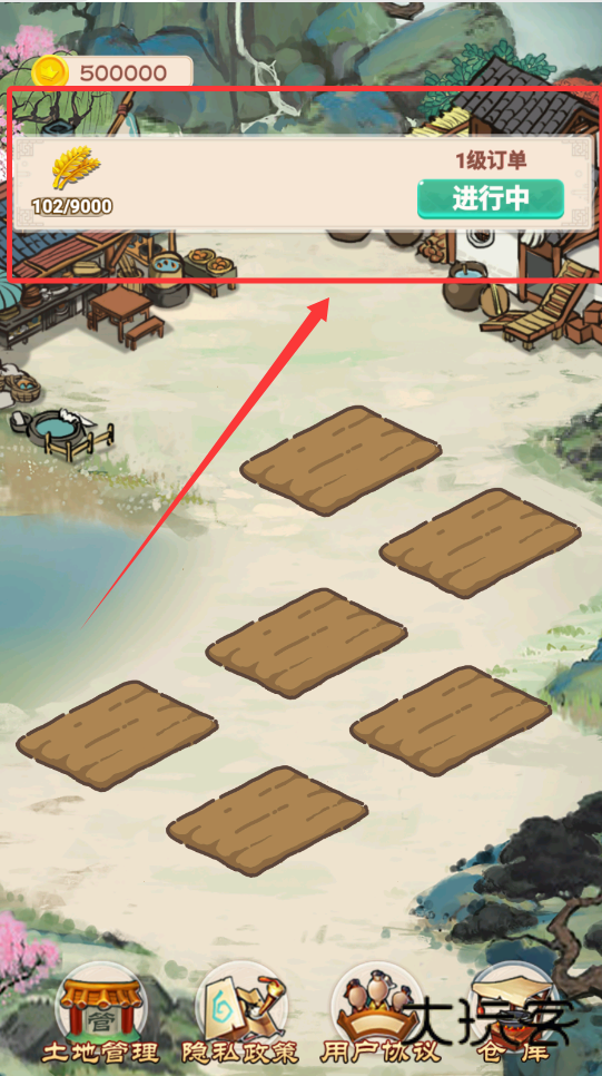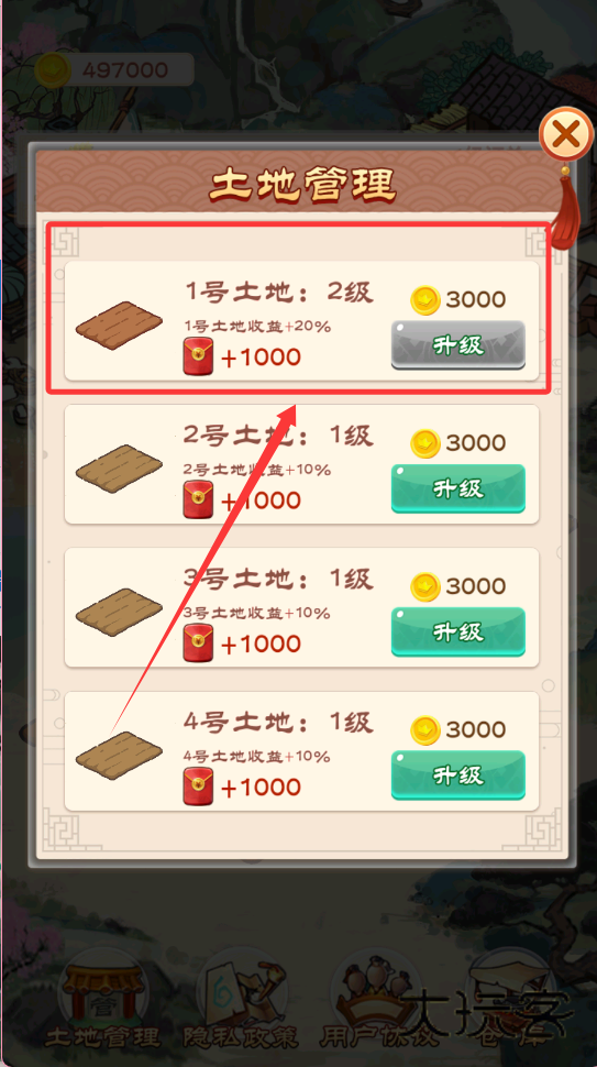 2、土地升级是收益增长的关键,每块土地都有等级和收益加成,比如2级土地收益多20%,点击“升级”按钮,花费金币提升土地等级,就能稳定提高每块地的产出。