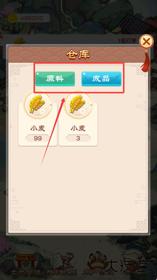 3、接着要学会处理订单和仓库,在“1级订单”界面查看任务进度,比如“102/8000”,然后在“仓库”里查看“小麦”等原料和成品数量,确保有足够货物来完成订单、获取奖励。
