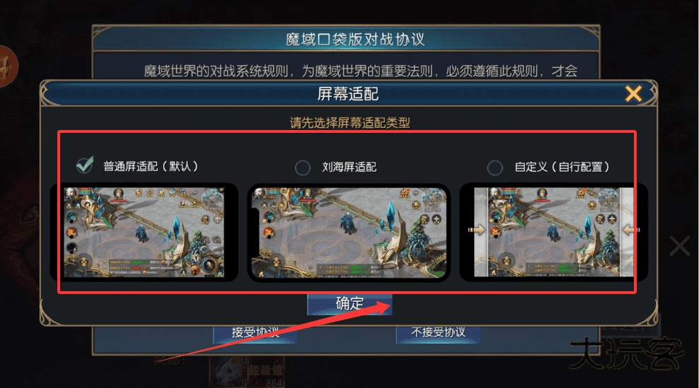 1、首次开启时,需阅读对战协议并根据手机屏幕选择适配模式,点击确定即可哦。