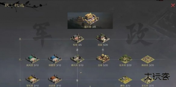 3.最后一种情况,非主流丐帮开荒队,老老实实9级再开始打4,三觉醒就是胜利。如果有南华这种最简单的4级地,如果打平了,毫不犹豫,直接撤退,哪怕一直平到10级都可以!一般来说,第一种情况在主力打两次4级地之后,便来到了第五章,另外两种情况,主力打4之前就到了第五章。此时该秒的任务直接秒,建筑等级如图所示: