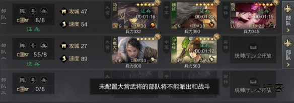 接下来是重中之重,也是开荒小白最需要改进的地方。屯田结束后,主力继续打3,期间如果主力在征兵,便可用二队打3,操作如图,将主力三个武将拆分到二三队进行征兵,补刀队放到一队,同时前锋挂上工具人,前期的3级地,最好打主城一环的,或者通过停留打3,降低战损,如果主力征兵还没好,补刀队打3又比较伤,可以将兵力最少的武将放到三队空位上征兵,征兵时间自行把握。如果主力刚打完一块4,此时补刀队还在征兵,可以将主力征兵时间拉到跟补刀队一样,征兵结束,换位置主力继续征兵,补刀队去第一队打3。