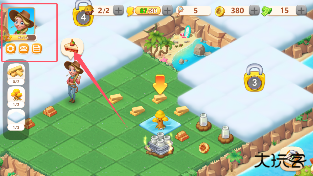 1、首先关注界面顶部的综合信息区,这里显示了等级4、经验进度、金币380、钞票15等核心数据。左侧的0/2、1/2、1/3提示了各类资源的当前存量与上限。