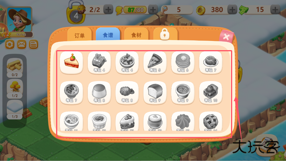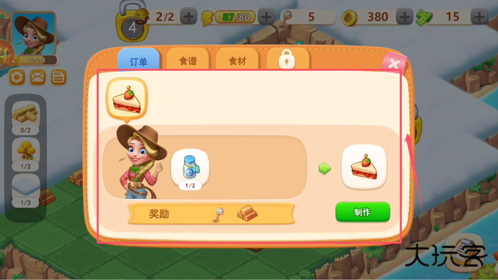 2、订单系统连接着生产与销售,牛仔角色给出的蛋糕订单需要5个罐子来完成。接受订单前要确保食材充足,制作过程中要关注剩余时间。