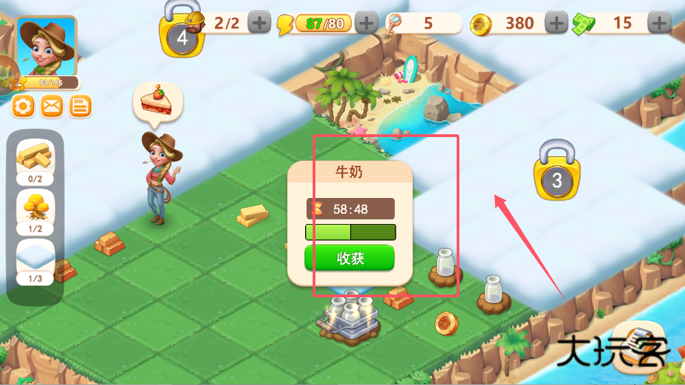 4、生产设施都有固定的运作周期,牛奶厂的倒计时显示剩余生产时间。你可以选择自然等待,也可以使用“消耗2移除”来立即完成。