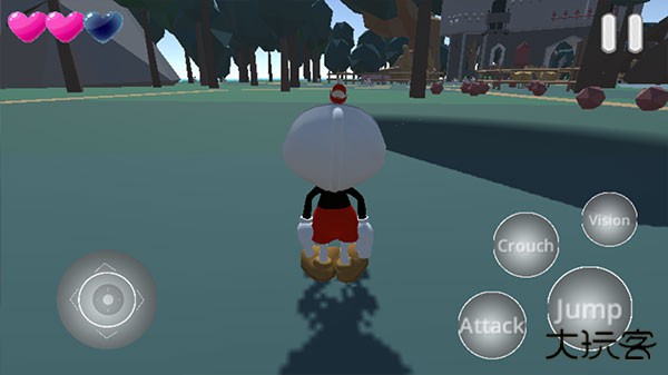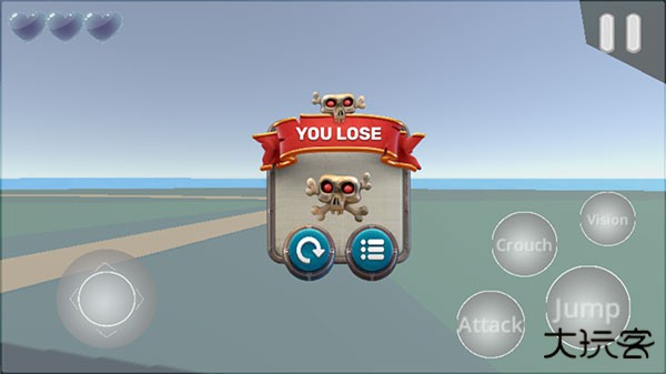 2、游戏界面左下角按钮负责控制角色的自由移动。界面右侧分布着四个核心功能按键:Crouch 用于下蹲潜行、Vision 切换观察视角、Attack 执行攻击动作、Jump 实现跳跃功能。