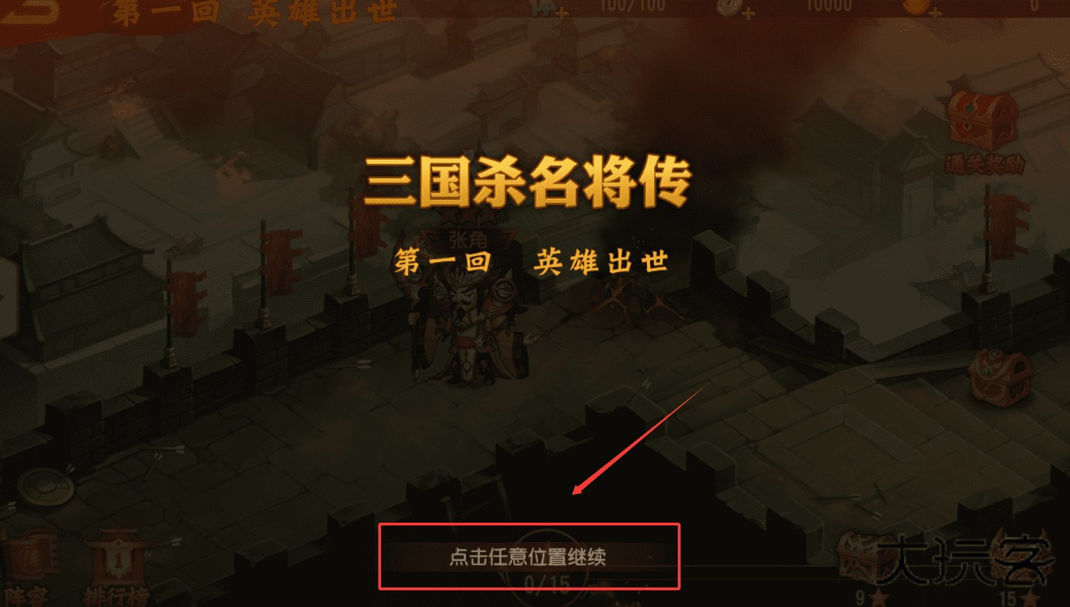2、接着啊,进入游戏后会看到“第一回 英雄出世”的剧情开场(图二),这时只需点击屏幕任意位置就能继续。