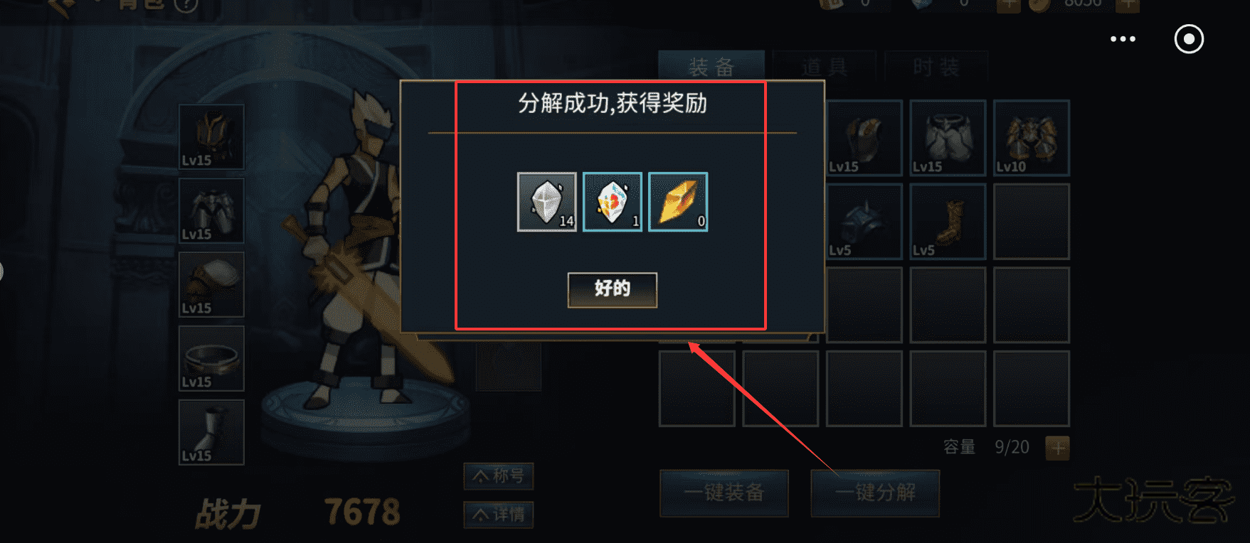 3、你可以勾选不需要的低级装备,然后点击“一键分解”来快速处理,分解后会获得强化材料等奖励,这样既能清理空间又能提升“战力”数值,真是一举两得。