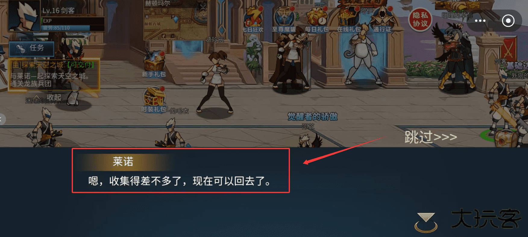 1、你需要点击任务文字,按照指引前往指定地点或与NPC“赛塔”互动来推进探索,完成即可获取经验与奖励。