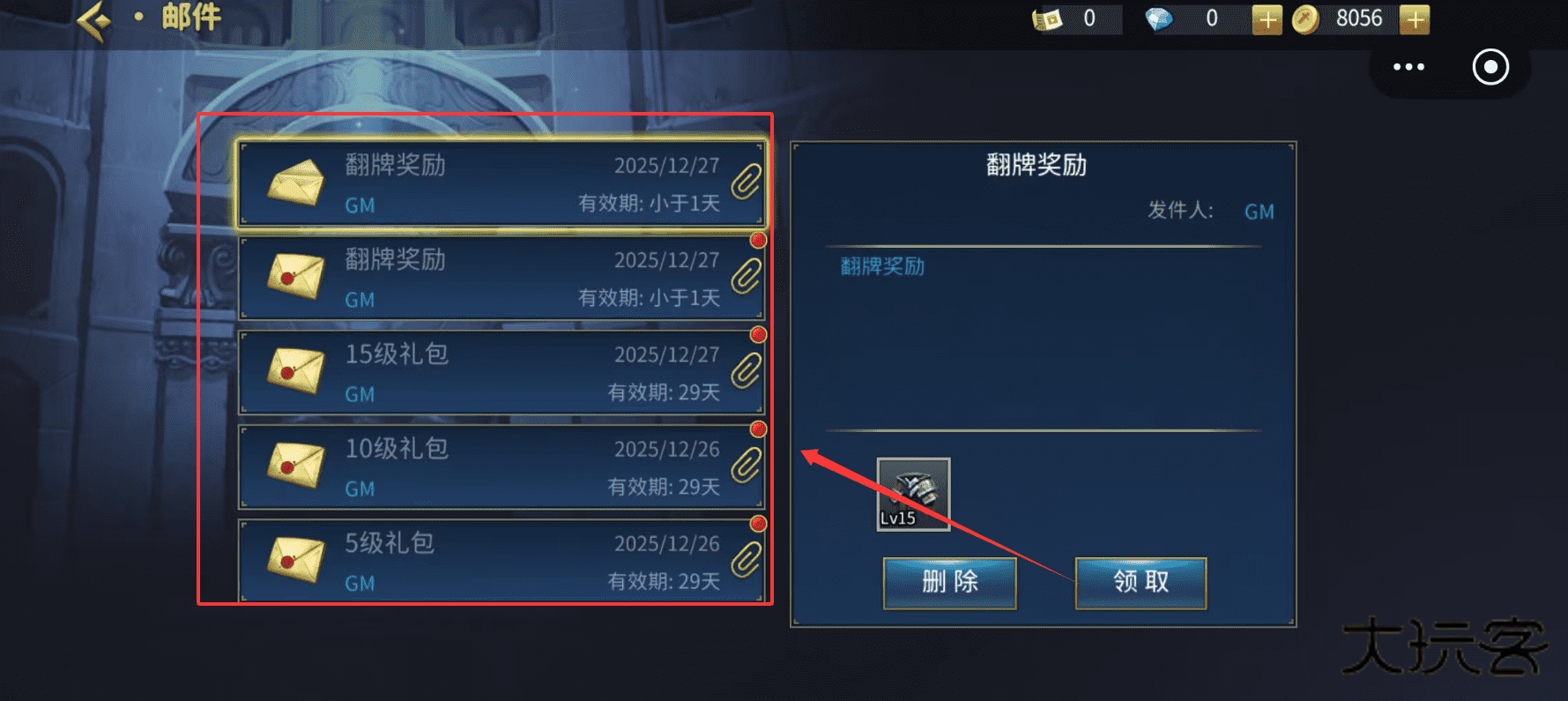 2、注意优先领取“有效期小于1天”的邮件,点击每封邮件下方的“领取”按钮即可将物品收入背包,礼包内容会自动使用或存入仓库。