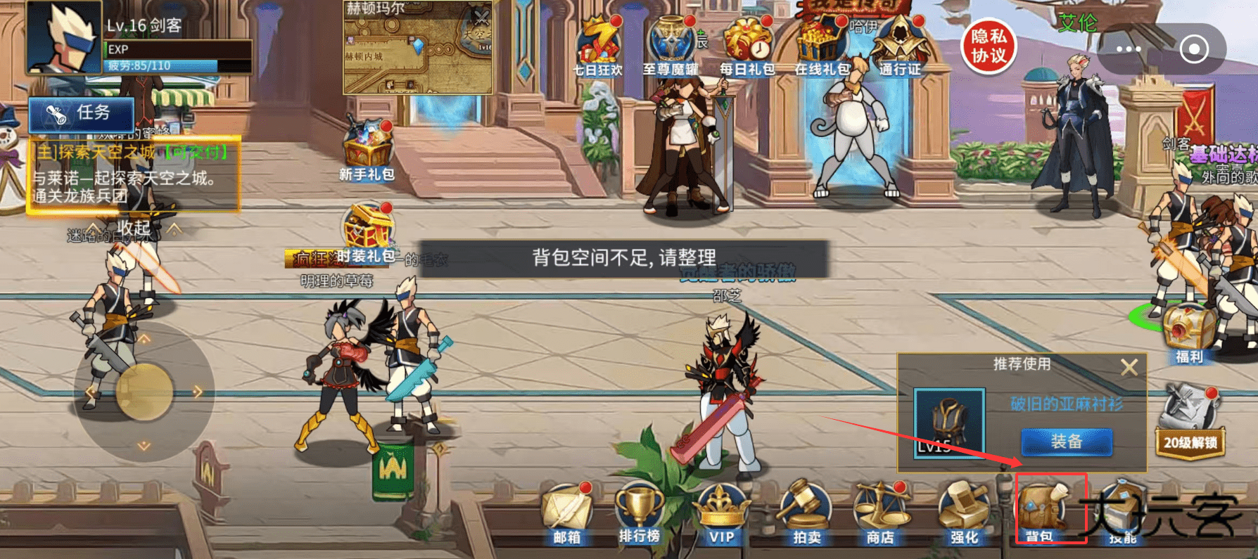 4、注意主界面提示如“青铜空间不足”,及时整理背包或使用扩充道具,这样在完成日常任务和探索时就不会被空间问题困扰了。