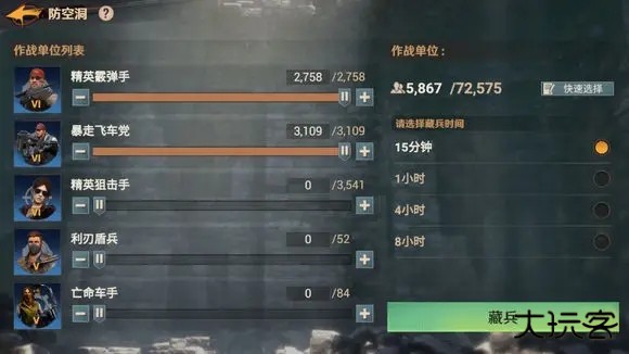 指将自己避难所内的士兵藏匿在防空洞中,或者是通过集结目标、增援盟友等方法将士兵保护起来,放置敌人入侵时遭受损失。