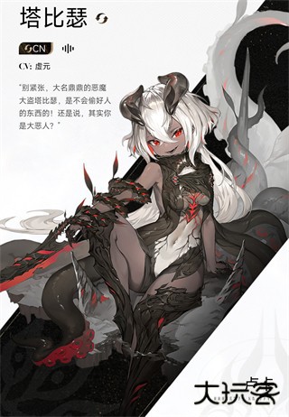 白发红瞳,带有恶魔角,服饰以黑红为主且风格较为尖锐