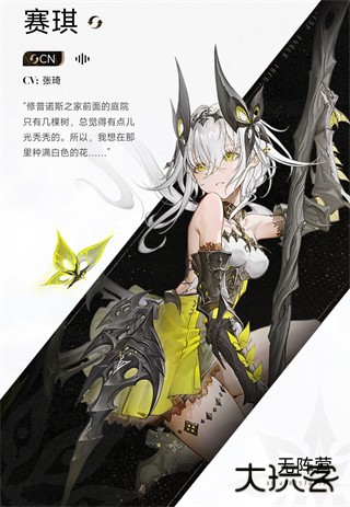 银发黄瞳,身着黑黄配色带有蝴蝶元素的服饰,手持造型独特的杖