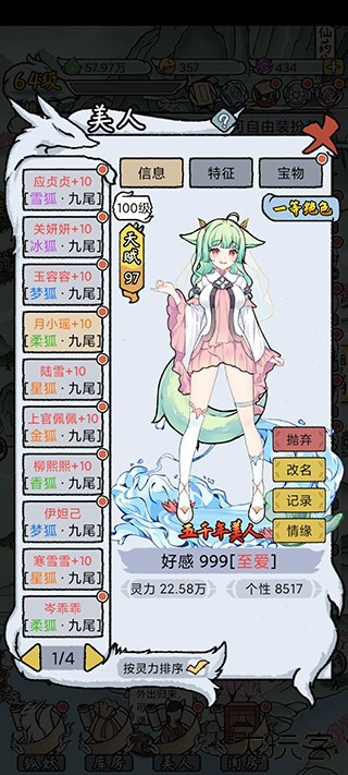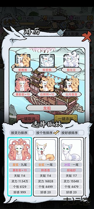 养成狐妖美人的过程中,可以发现她们的不同个性喔,比如追过北极星、试过横着走路、喜欢扒拉新尾巴、烤过小兔兔、清冷如仙、喜食阳气……多达500+