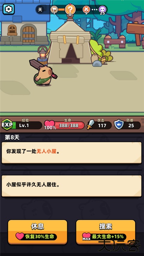 卡皮巴拉GO是一款非常有趣的休闲冒险手游,游戏以水豚为主角,玩家将带领可爱的水豚在随机生成的文字关卡里展开冒险,并通过点击下一天推进关卡,而且每一天都会发生随机事件,玩家可能获得装备、技能,也有可能遭遇敌人,进行战斗。游戏采用自动回合制战斗,玩家需要根据敌人的属性,合理搭配水豚的装备和技能组合。快来卡皮巴拉GO和可爱的水豚一起踏上冒险旅程吧!