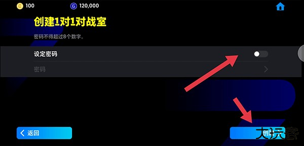5、若是玩家创建对战室,就点击创建1对1对战室,然后设定密码后点击创建,当然你也可以选择不创建